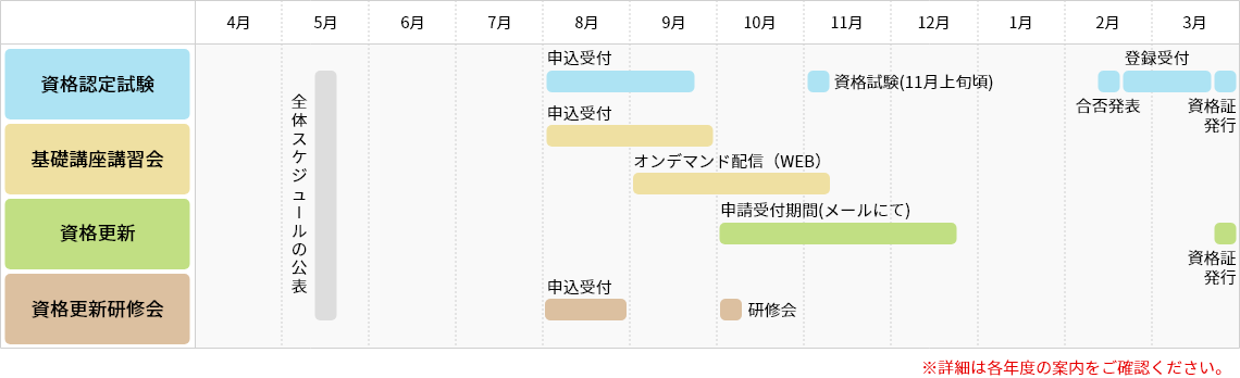 資格認定試験、基礎講座講習会、資格更新、資格更新研修会等のスケジュール
